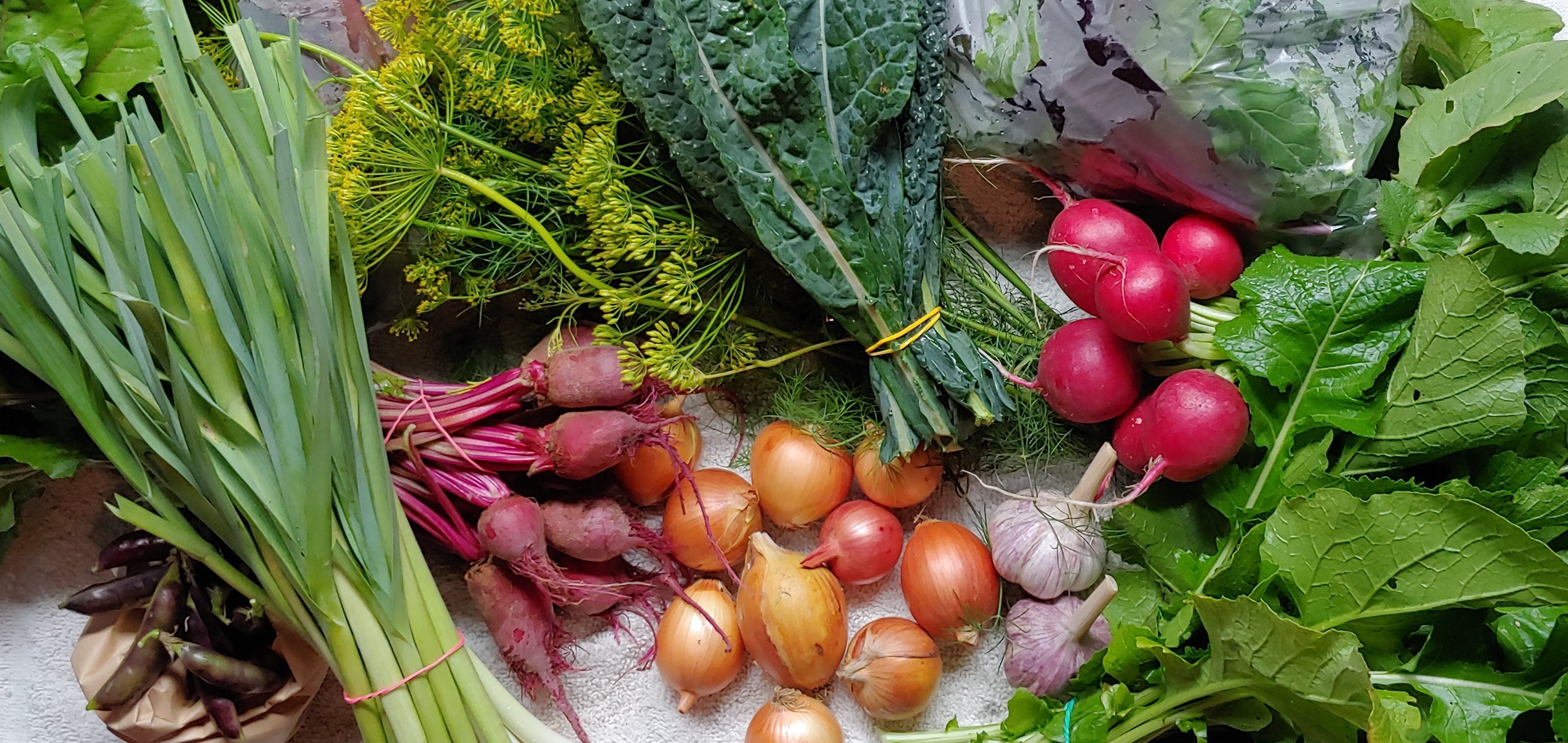 The vegetables available vary from week to week according to the season and our harvest calendar. Have a look at our CSA Share Examples & Crop Calendar to learn more.