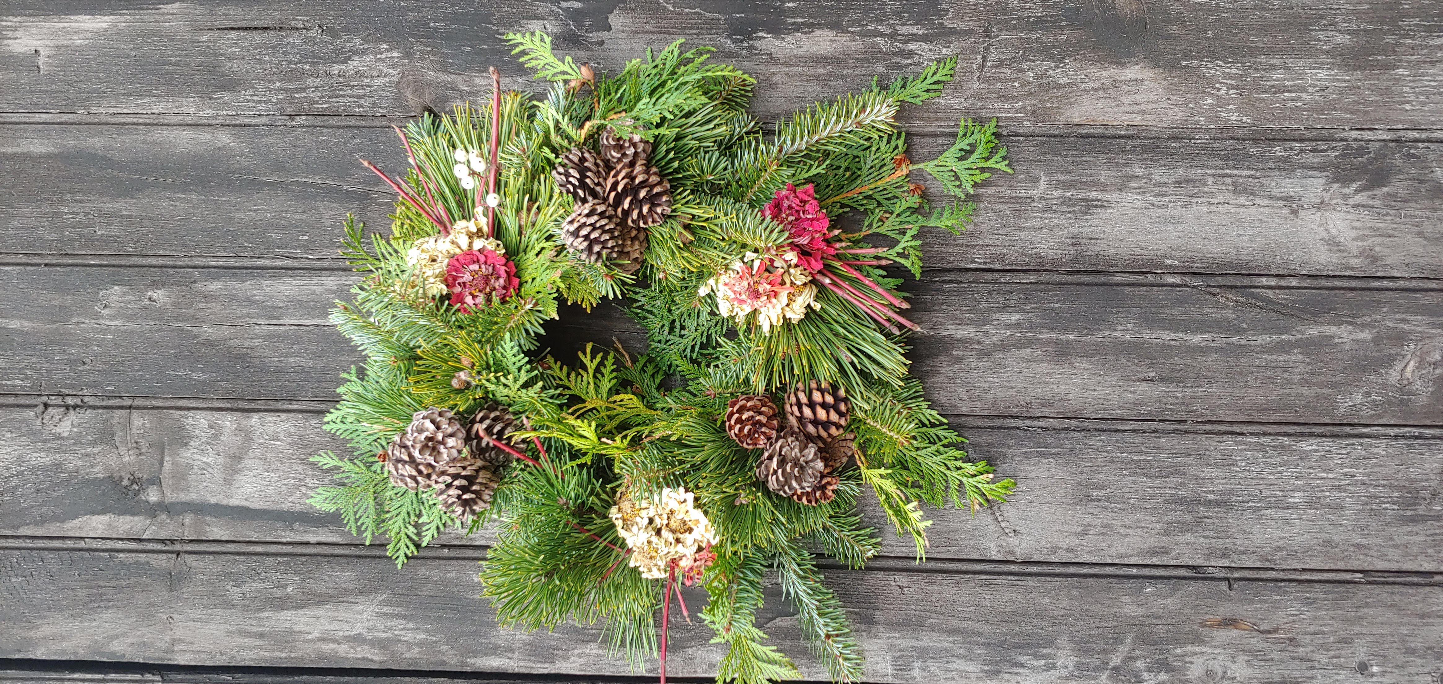 Your evergreen arrangement consists of pesticide-free greenery and flowers grown & responsibly-foraged on our farm. Wreath forms are made of foraged willow and wild grapevine from our property, or of metal.